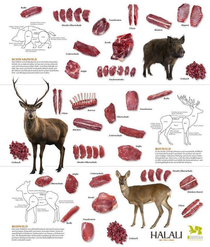 Sie können Wild in der Decke/Schwarte, grob zerlegt oder als küchenfertiges Bratenstück erwerben.